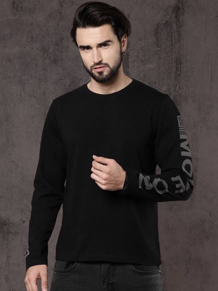 Black solid T-shirt, has a round neck, long sleeves The model (height 6') is wearing a size M Cotton Machine-wash